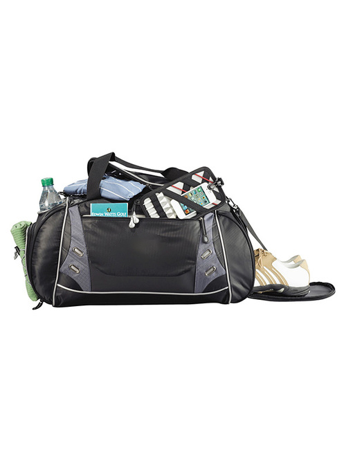 Zippered main compartment with U-shaped opening. Front zippered pocket with earbud port includes removable sport techtrap organizer. Large ventilated side pocket holds shoes or damp garments. Additional side zippered accessory pocket with exterior elastic shock cord for maximum storage. This sporty bag also includes an open insulated bottle pocket. Handles made of durable webbing with comfortable handle wrap; side grab handle. Detachable, adjustable shoulder strap features the Drive series unique ventilation patterned shoulder pad. Signature elleven™ lining and hardware. Free run charges for embroidery up to 7500 stitches.