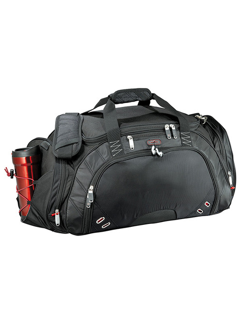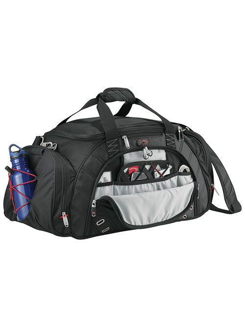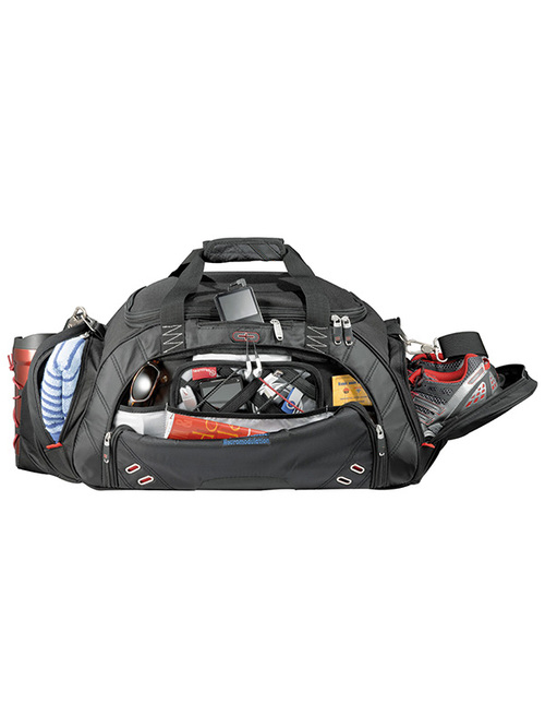 Zippered main compartment with U-shaped opening. Front top media pocket with earbud port. Large zippered front pocket includes removable techtrap organizer panel and pocket organization. Large ventilated side pocket holds shoes or damp garments. Additional side zippered accessory pocket with exterior elastic shock cord for maximum storage. Handles made of durable webbing with comfortable handle wrap. Padded, detachable, adjustable shoulder strap. Signature elleven™ lining and hardware. Free run charges for embroidery up to 7500 stitches.