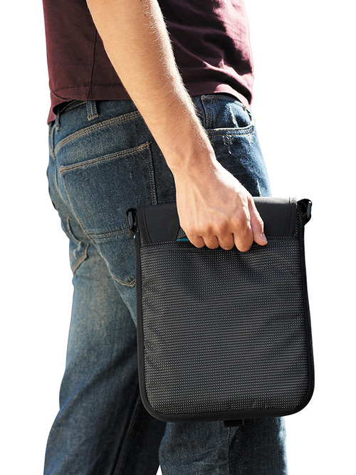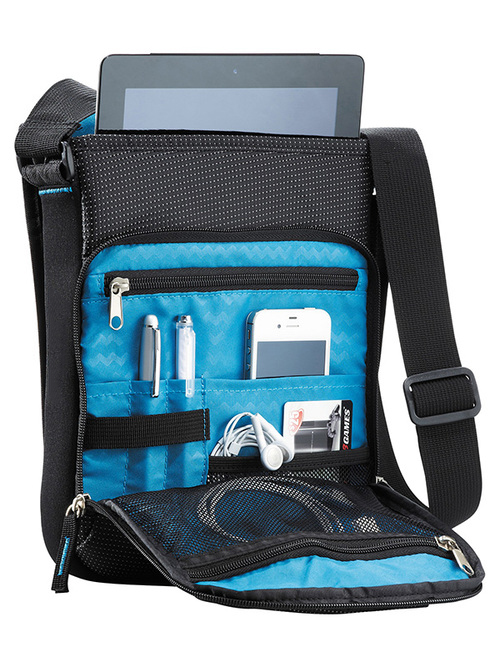 This tablet/iPad bag features an open main compartment with protective flap includes zippered front pocket. Main compartment is fully lined with soft nylex; the perfect size and place for your iPad, tablet or e-reader. Under the flap is another fully zippered pocket with deluxe organization and additional zippered and mesh pockets. Special webbed home for your Zoom cord management. Structured neoprene sides. Unique hidden grab handle and adjustable shoulder strap. Signature Zoom™ lining and hardware.