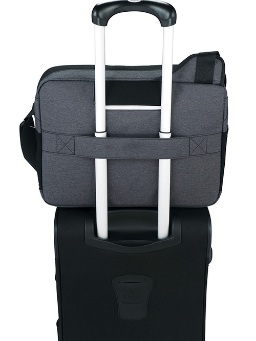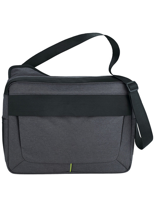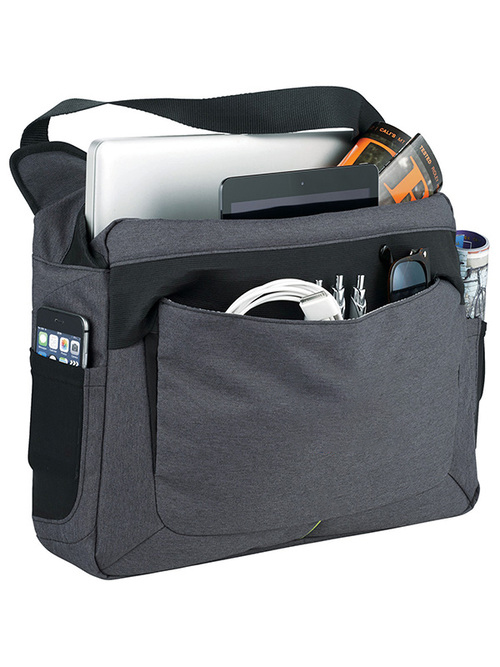 Power Stretch Computer Messenger Bag is the solution for those that stretch the limits of mobile tech. Zippered main compartment has a padded sleeve for your laptop up to 17" and a dedicated neoprene pocket for your iPad or tablet. The dedicated neoprene pocket for your mobile charging solution also had a port that runs to the outside of the bag and into the front tablet pocket so you can charge all your mobile devices without having to remove them from the bag, and also lets you run a cord outside to power your charger. The outside of the bag features a front accessory pocket that secures with elastic for quick access to all your mobile devices such as your iPhone or other Smartphone. Side mesh pockets for your phone or cables. Neoprene grab handle. Adjustable shoulder strap. Custom Zoom lining and zipper pullers. Trolley sleeve on back.